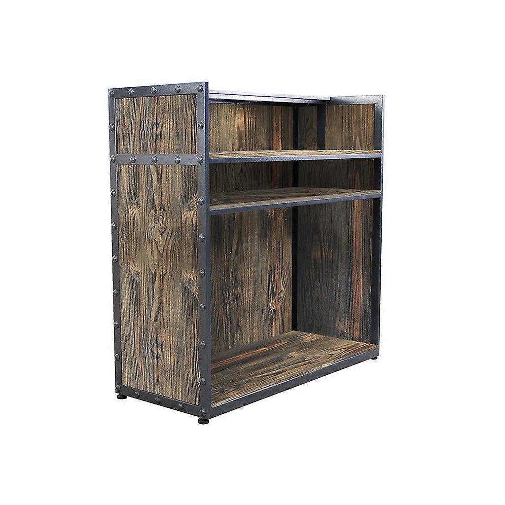 Reception för frisörer och frisörsalonger. Tillverkad av plywoodpaneler, belagda med melamin med rustik träfinish. Svart metallram med metallnitar.