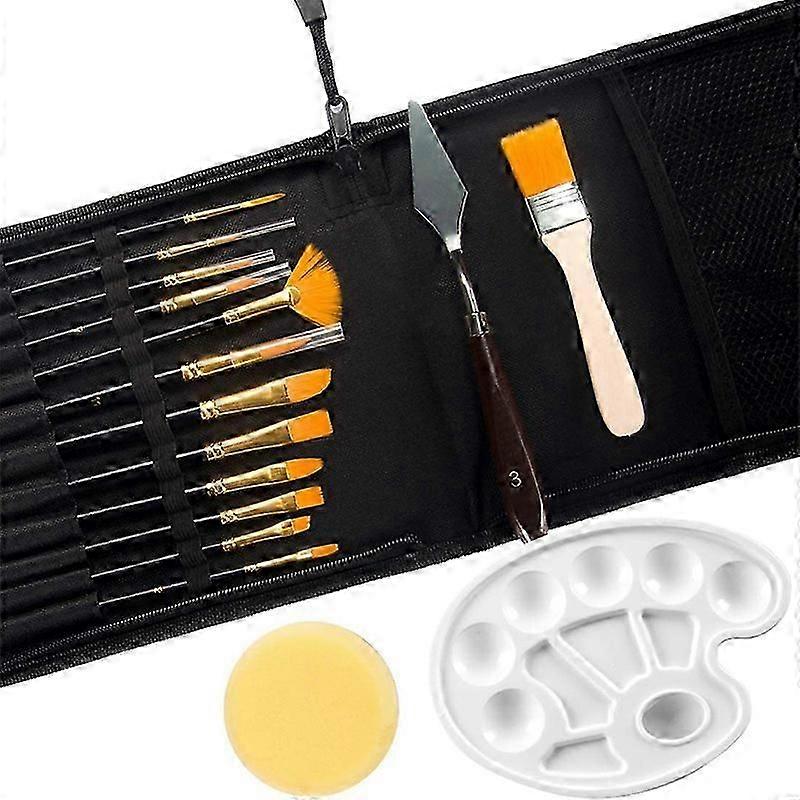 16 Pcs Paint Brushes Set 12 Sizes Painting Brush with Palette Knife, Sponge and Oil Tray for Acryli