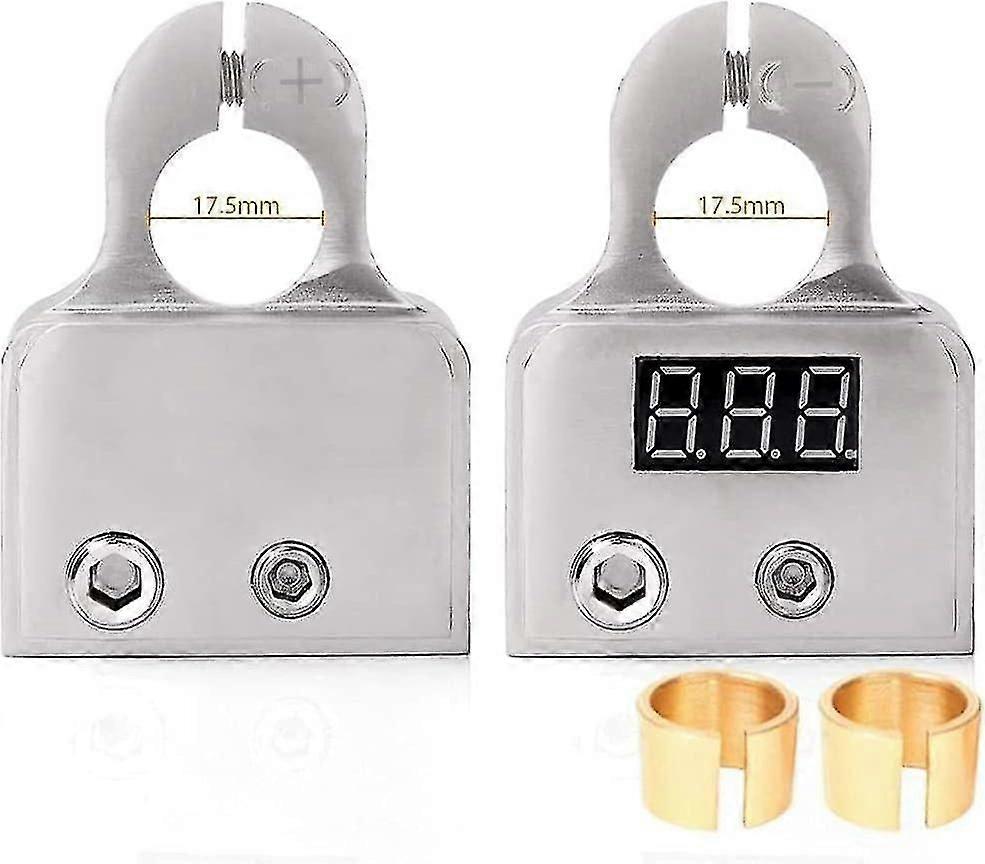 0/4/8/10 gauge AWG positive and negative battery clamps with a voltmeter, and washers (1 Pair). Equipped with a 12-24V voltmeter with an error of less than 0.5V, real-time monitoring of the car battery voltage. Copper alloys, satin nickel finish, high-temperature resistant material for environmental protection. positive and negative connections take over the connection. Waterproof and dustproof, longer service life; Transparent acrylic covers, prevent the battery end from being damaged by the environment. Ideal for advanced audio technology, heavy-duty lighting or inverter charging systems, heavy and commercial use. Color: As Pic Shown Size:70 x 50mm Packing List: 1 x Car Battery Terminal with Voltmeter(Positive ) 1 x Car Battery Terminal (Negative) 2 x Spacer Shims 2 x Car Battery Terminal Covers.Items from Sheng Xinshun's shop