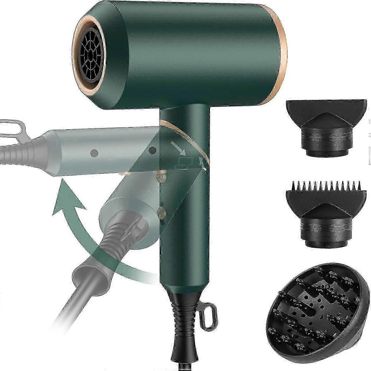 Anion technology: hair dryer ions with 2000 W has high speed and strong wind, which can dry the hair in a short time. The ion technology used can moisturise the hair and prevents static charging of the hair.Noise reduction and 3 wind speeds: the hair dryer quiet has built-in intelligent noise reduction system, it can reduce the noise during use. The hair dryer has 3 wind speeds and independent cold wind button. You can easily adjust the wind speed and temperature to suit your hair care needs.Foldable and portable: the small travel hair dryer, is lighter than ordinary hair dryer, and the use is labour-saving. It can be easily folded up and therefore easy to take with you when travelling, as well as the carrying handle, which makes the hair dryer easy to hang.Hair care at constant temperature: the hair dryer uses heat balance technology to distribute heat evenly and avoid heat damage to the hair. At the same time, it has an overheating protection system that automatically shuts off the power when the temperature is too high to achieve safe hair drying.Great GiftThe hair dryer comes with 2 nozzles and 1 diffuser for curls to meet your different styling needs. In addition, a 2.5 m long cable offers you enough freedom of movement. This foldable travel dryer is an ideal choice for home, travel or business and is also very good as a gift.<br> Colour Name:GreenSpecification:Input voltage: 220-240 V.Rated power: 1800 - 2000 W.Cable length: 2.5 m.Wind speed: 3 range.<br> Package includes:1 x hair dryer.1 x centralised nozzle with comb.1 x centralised nozzle.1 x diffuser.1 x user manual (English language not guaranteed).