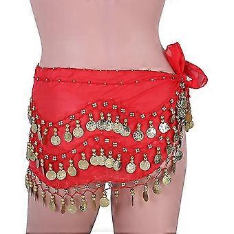 Buikdans sjaal sjaal riem wave gedrapeerde gouden munt rok verpakt met gouden munt Chiffon gedrapeerde buikdans riem voor vrouwen meisjes (rood) (1 stuks)