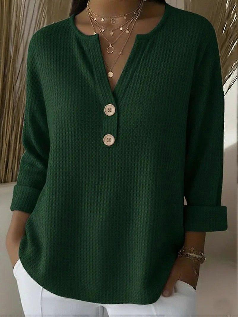 Fashionable V-Neck Buttoned Waffle-Pattern Solid-Color Loose-Fitting Long-Sleeve Pullover