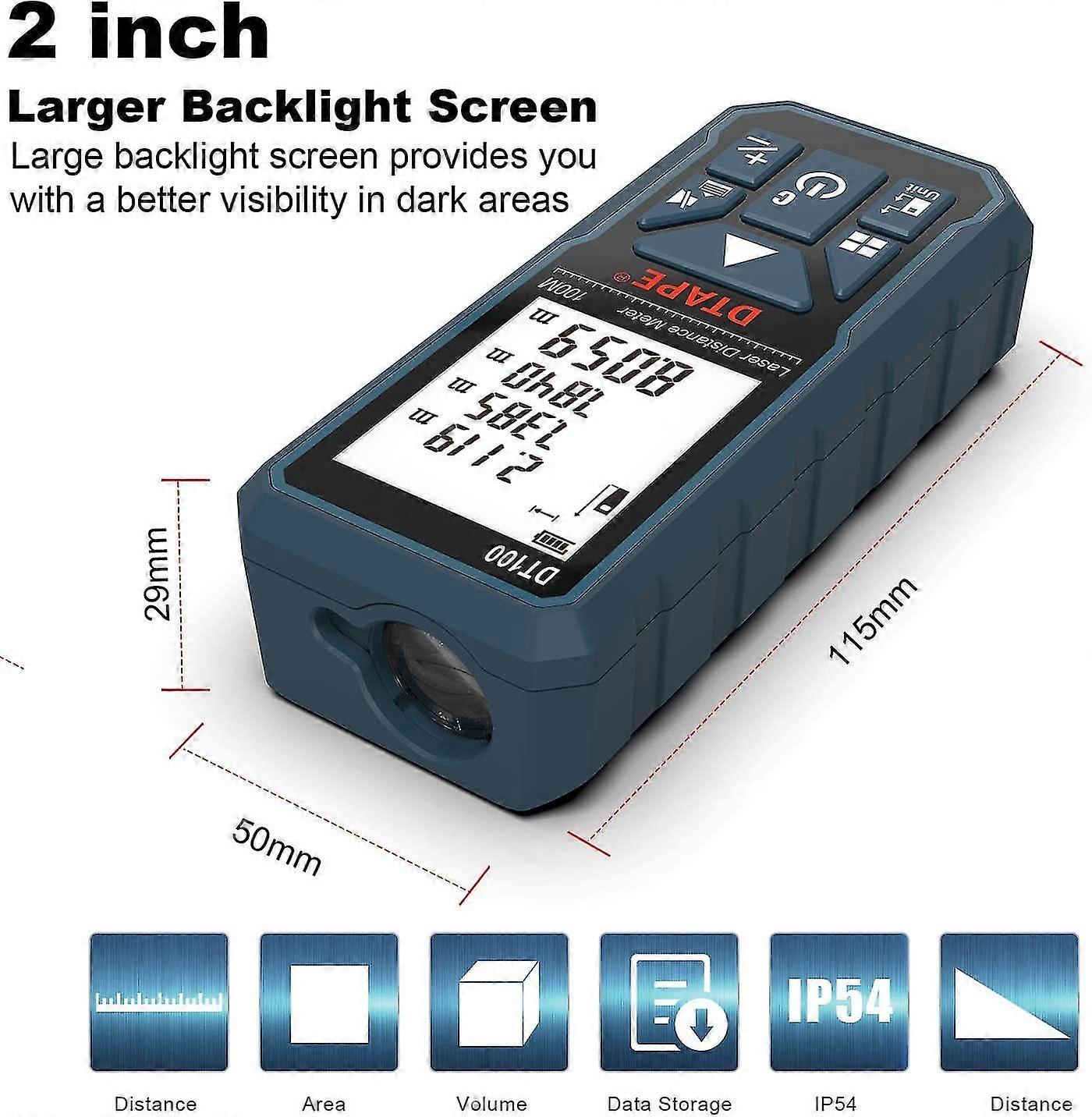 Laser Distance Meter 100m,dt100 Portable Handle Digital Laser Measure Tool Range Finder Larger Backlit Lcd 4 Line Display Ip54 Shockproof Battery Incl