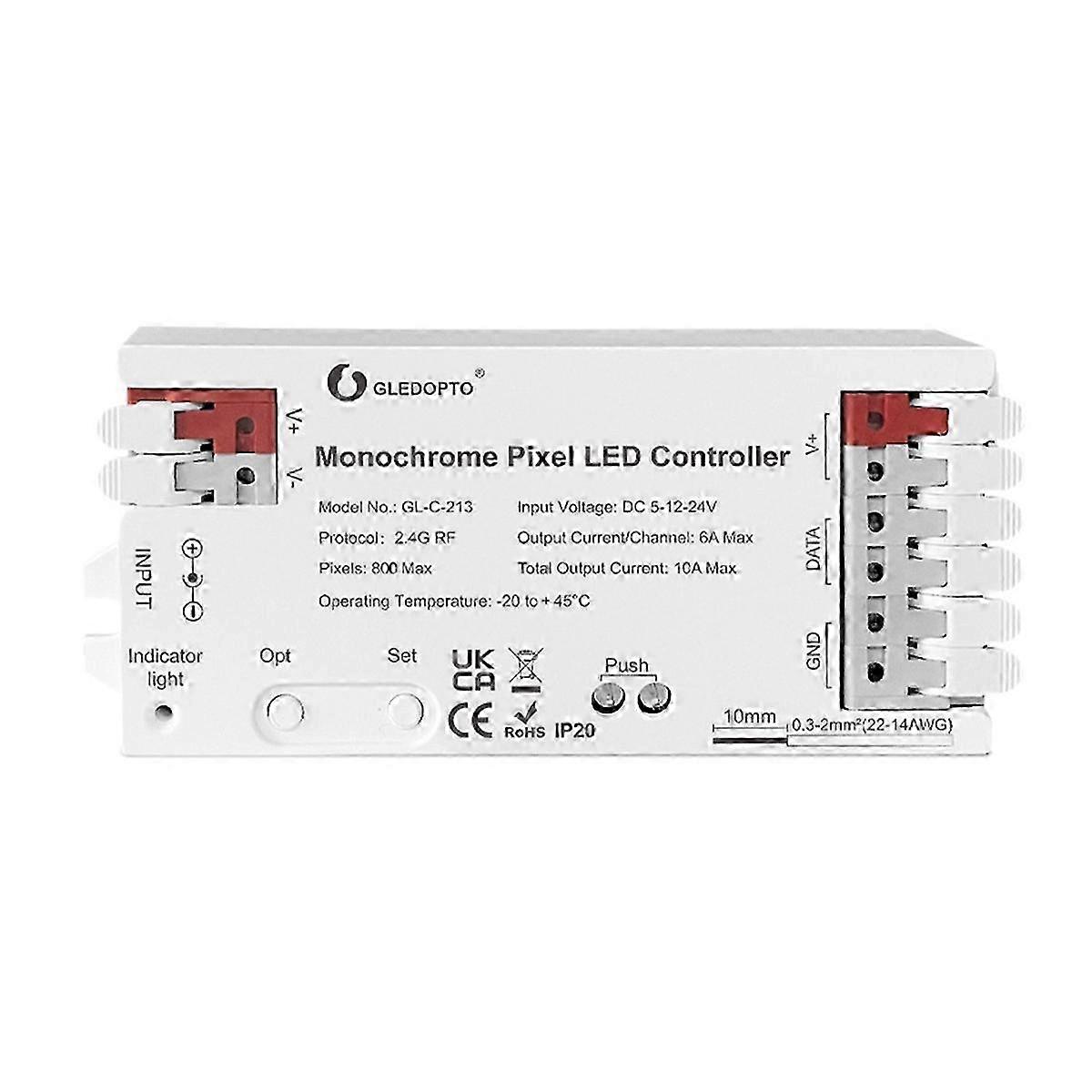 Easy to operate, easy to use. Smooth ition and Responsive: Long remote control distance, stable signal mission. Two power input methods, suitable for more application scenarios Flame Retardant PC, More secure in use Product Name: Monochrome Pixel LED Controller Model No.:GL-C-213 Input Voltage:DC 5-12-24V Output Current/Channel:6A Max Pixels:800 Max Total Output Current:10A Max Protection Rate:IP20 Net weight:51.0g Colour:White Material:PC Package Contents: 1 * LED Controler Only the above package content, other products are not included. Note: Light reflection and different displays may cause the color of the item in the picture a little different from the real thing. The measurement allowed error is +/- 1-3cm.