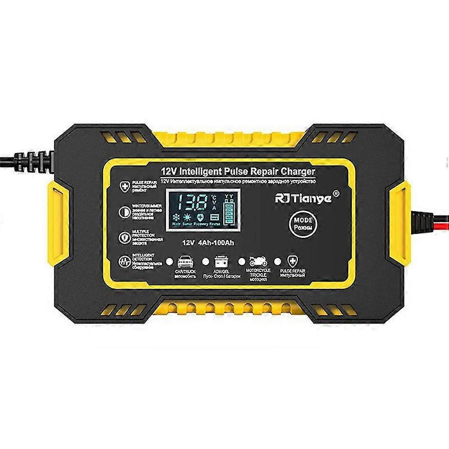 Overheat,overcharge,short circuit & reverse polarity protection Professional automatic switch mode For charging AGM,GEL,SLA and Wet batteries LCD display&pulse repair charge Microprocessor controlled<br><br>Maximizes battery life Plug Type:UK plug,it applies to Malaysia, the United Kingdom and so on. Voltage:AC100-240V Colour:Black-Yellow Material:Metal Size:15x6.2x8.5cm<br><br>Package Contents: 1 * Battery Charger<br><br>Only the above package content, other products are not included. Note: Light reflection and different displays may cause the color of the item in the picture a little different from the real thing. The measurement allowed error is +/- 1-3cm.