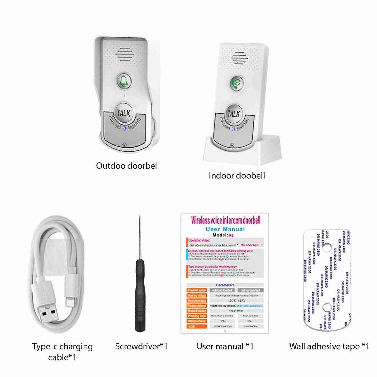 Wireless Rechargeable Doorbell Intercom, 3.7V 1800mAh, White