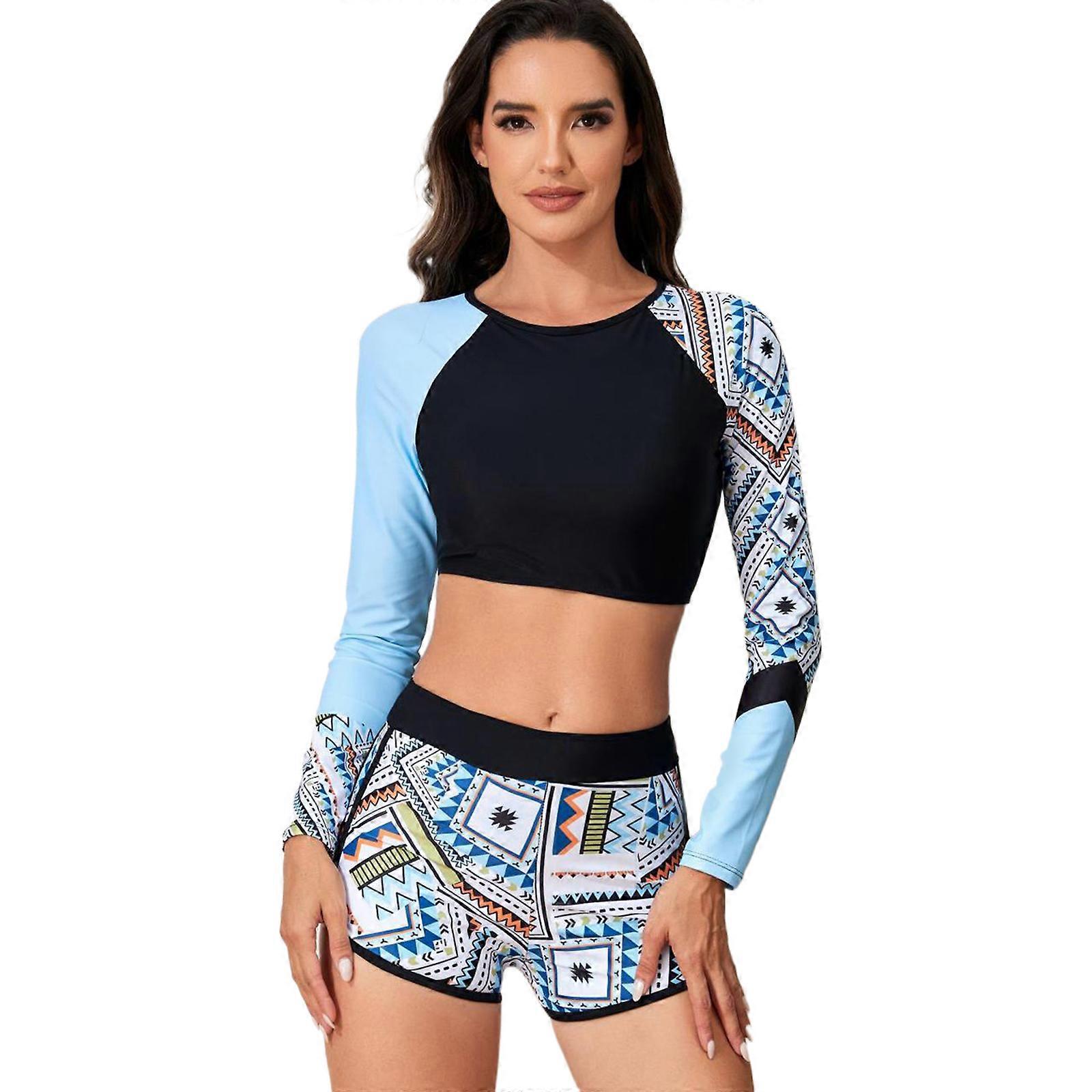 Long Sleeves Swimwear for Women Flower Printed Swimsuits Two Pieces Split Bathing Suit Crop Top with Briefs Beachwear Sky Blue XL